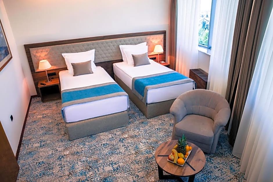 The spacious double room offers air conditioning, a mini-bar, as well as a private bathroom boasting a bath and a bidet. The double room has carpeted floors, a seating area with a flat-screen TV with cable channels, a wardrobe, a safe deposit box, as well as an electric kettle.